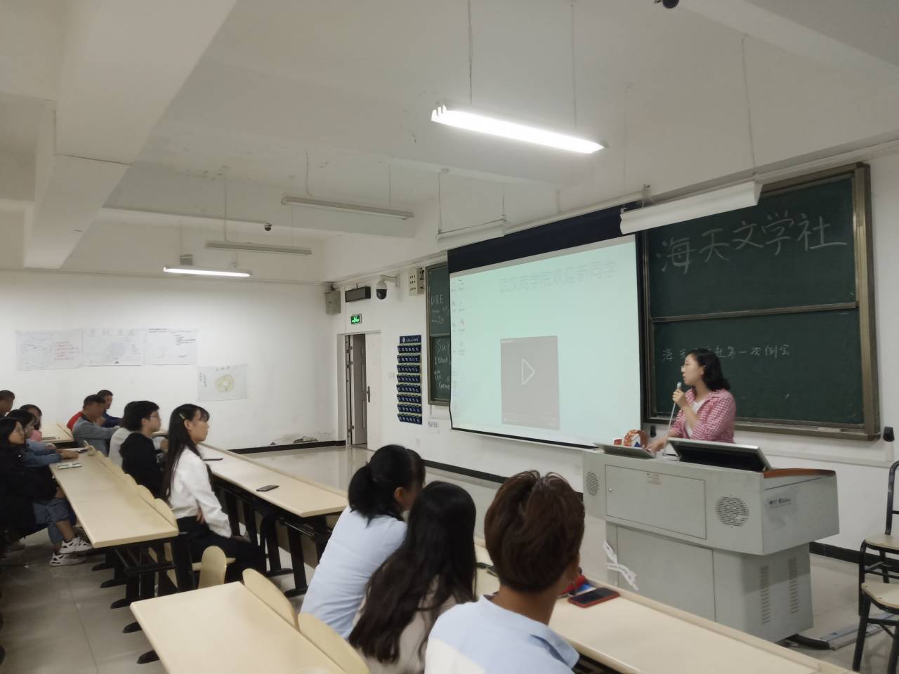 2019年10月12日晚,海天文学社“不忘初心,牢记使命”读书分享会在伟德国际1946会议室举办。此次活动由海天文学社负责人胡成、曾赞潼等社干主持,并邀请了伟德国际1946吴冰洁、曹艳两名老师参加。