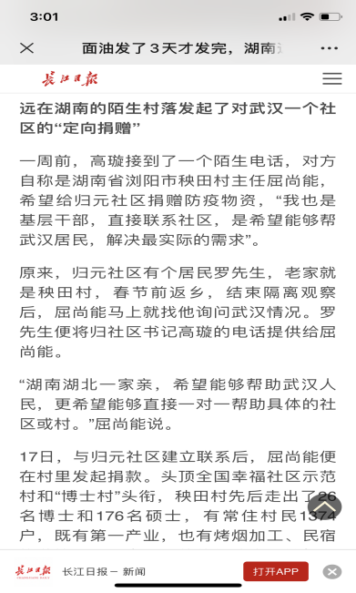 公司党总支书记高静前期在湖南浏阳老家秧田村,由于未出隔离期不得返汉,心系第一批下沉同志缺乏防护物资和粮食储备,与家人自发向武汉市汉阳区归元社区捐款1000元用于防护物资的补足。后续联系到村主任,集合全村居民的力量,共筹集到捐款18.6万元,用捐款为归园社区居民对口购买1500份物资,两辆满载生活用品的大货车从浏阳市出发,驶往武汉,在困难时刻同舟共济,共克时艰,此事迹也被长江日报浓墨报道。