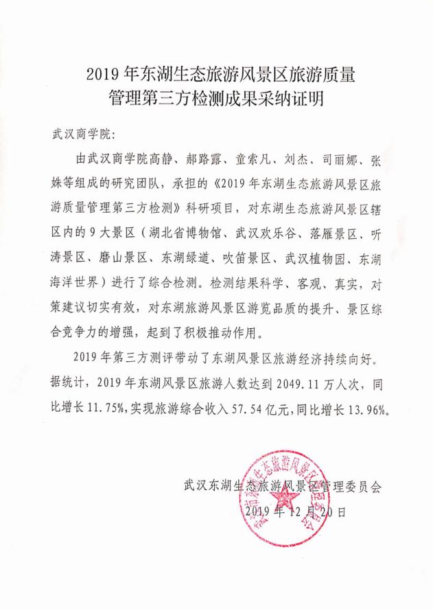 为全面提升东湖旅游风景区的游览品质,提升游客满意度,增强景区的综合竞争力,加强对景区的动态性管理与追踪,达到国家旅游局对A级旅游景区的综合要求,伟德国际1946官网文旅产业研究中心受东湖风景区旅游局委托,对其所辖范围内的A级景区、绿道、马鞍山 森林公园(吹笛景区)开展第三方检测工作。检测工作带动东湖风景区经济持续向好,2019年东湖绿道运营管理考核第三方检测成果和东湖生态旅游风景区旅游质量管理第三方检测成果均被武汉东湖生态旅游风景管理委员会采纳。