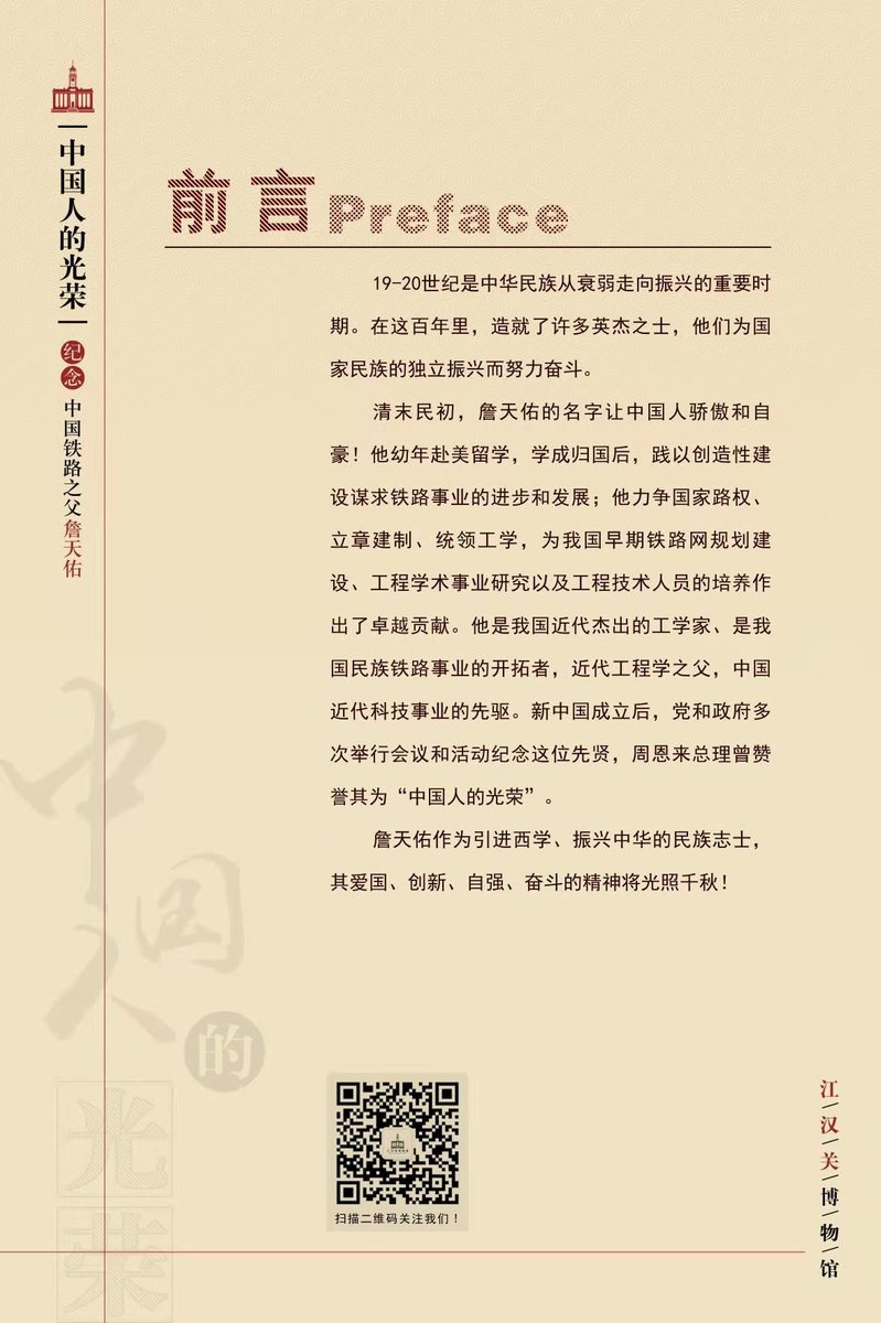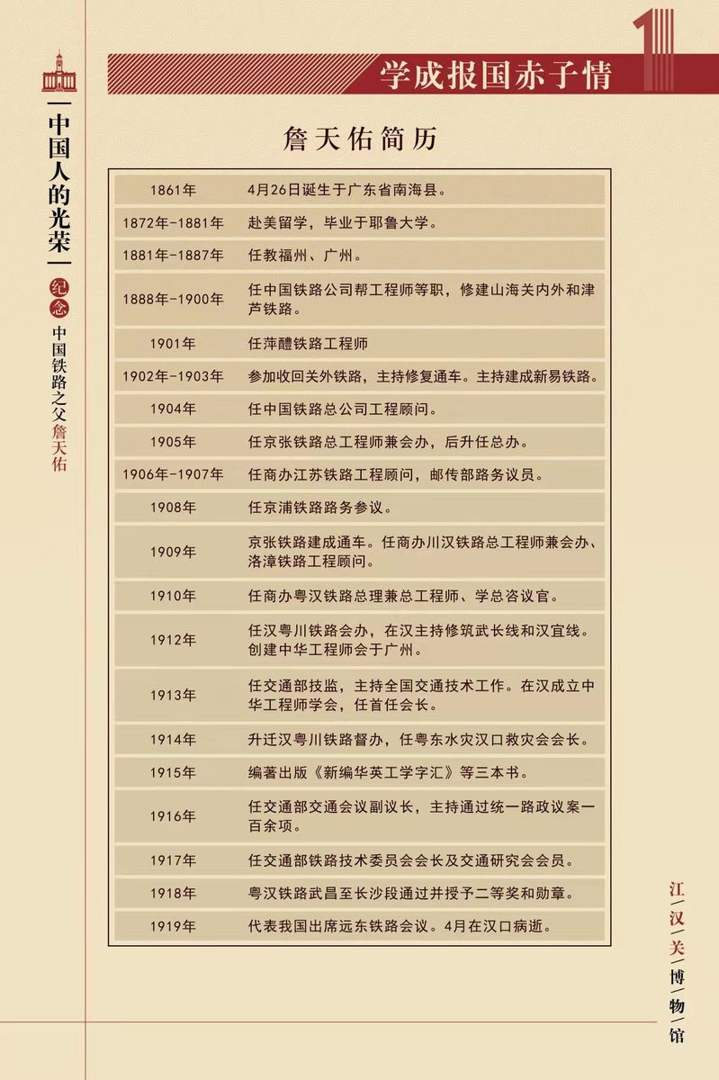 为让同学们感受一代代爱国者艰苦创业的光荣梦想,培养广老员工的爱国主义精神和自强不息意识。4月26日-30日,由公司与江汉关博物馆联合举办的“中国人的光荣—纪念‘中国铁路之父’詹天佑”展览北四门口展出。