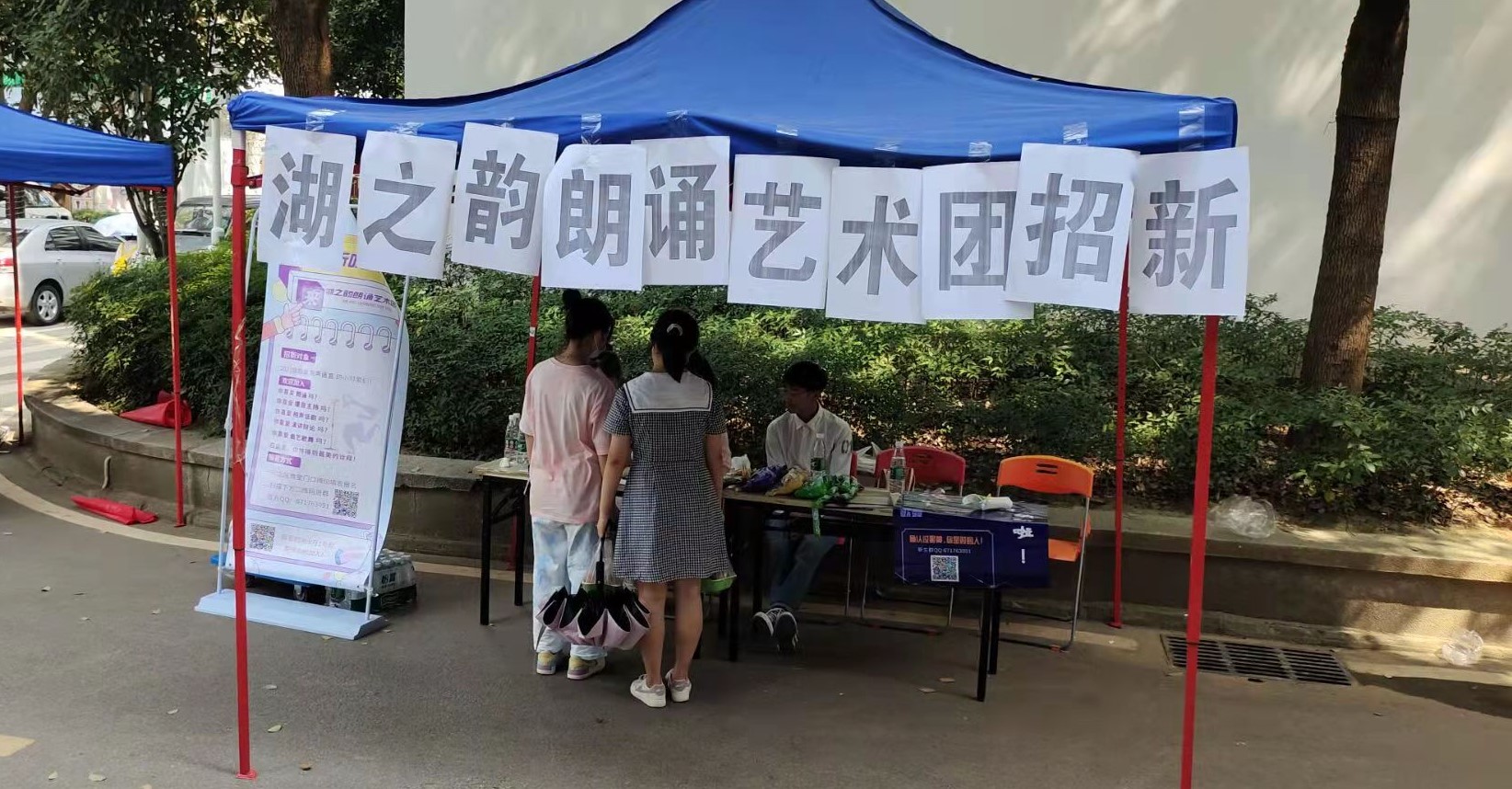 为了确保招新活动的顺利进行,湖之韵朗诵艺术团于南、北两个校区分设招新报名点。中午12点随着铃声的落下,同学们陆陆续续走出教学楼,招新小摊位逐渐热闹了起来,同学们积极地向学姐学长提出有关进团的要求及团内活动内容等问题。湖之韵朗诵艺术团特意准备好小礼品送给前来咨询和报名的同学。不少同学拿着小礼品和学姐学长合影留念,招新报名点生机蓬勃。