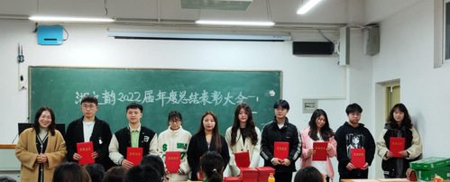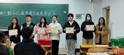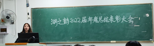 总结表彰大会第二项由团长龚光琴同学颁发2022年年度优秀干部奖状,2022年在各位负责人的带领下团员学习朗诵知识,湖之韵朗诵艺术团举办多项校级活动,促进艺术团发展。