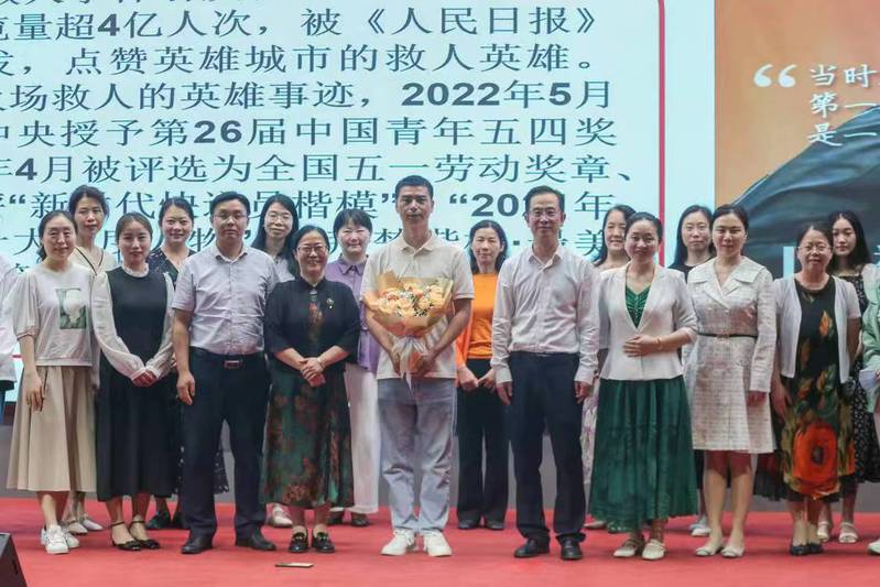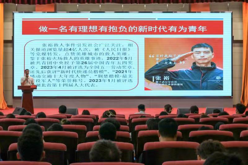 张裕首先讲述了他救人的经历,2021年12月10日,武汉市江汉区某居民家中突然起火,他发现后徒手爬楼充当“人体台阶”,及时救下了火场中的一家三口;然后又分享了他为安全准时地送达每一份快递,工作时随身揣着小本子,记录着不同客户的需求,每当晚上收工的时候抬头看到万家灯火、点点星光,就觉得自己这一天没有白过;最后又告诉我们老员工:“人生在勤,勤则不匮”,在校园“象牙塔”里的同学们,青春和时光最珍贵,要坚定自己的理想信念,仰望星空筑梦,脚踏实地学习,走向成长、成就自我,为未来打下扎实基础,赢得人生属于自己的精彩。张裕的救人事迹和工作热情深深地感染了在场的员工,员工为张裕献上鲜花表示敬佩。