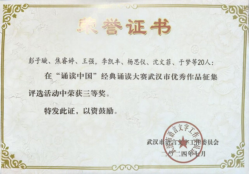 典耀中华,赓续文脉。中华经典诵写讲大赛由教育部、国家语委举办,旨在贯彻落实党的二十大精神,服务教育强国、文化强国建设,加大国家通用语言文字推广力度,传承发展中华优秀语言文化,落实全国青少年读书行动,深化“典耀中华”主题读书。湖之韵朗诵艺术团在“诵读中国”经典诵读大赛中荣获武汉市三等奖。